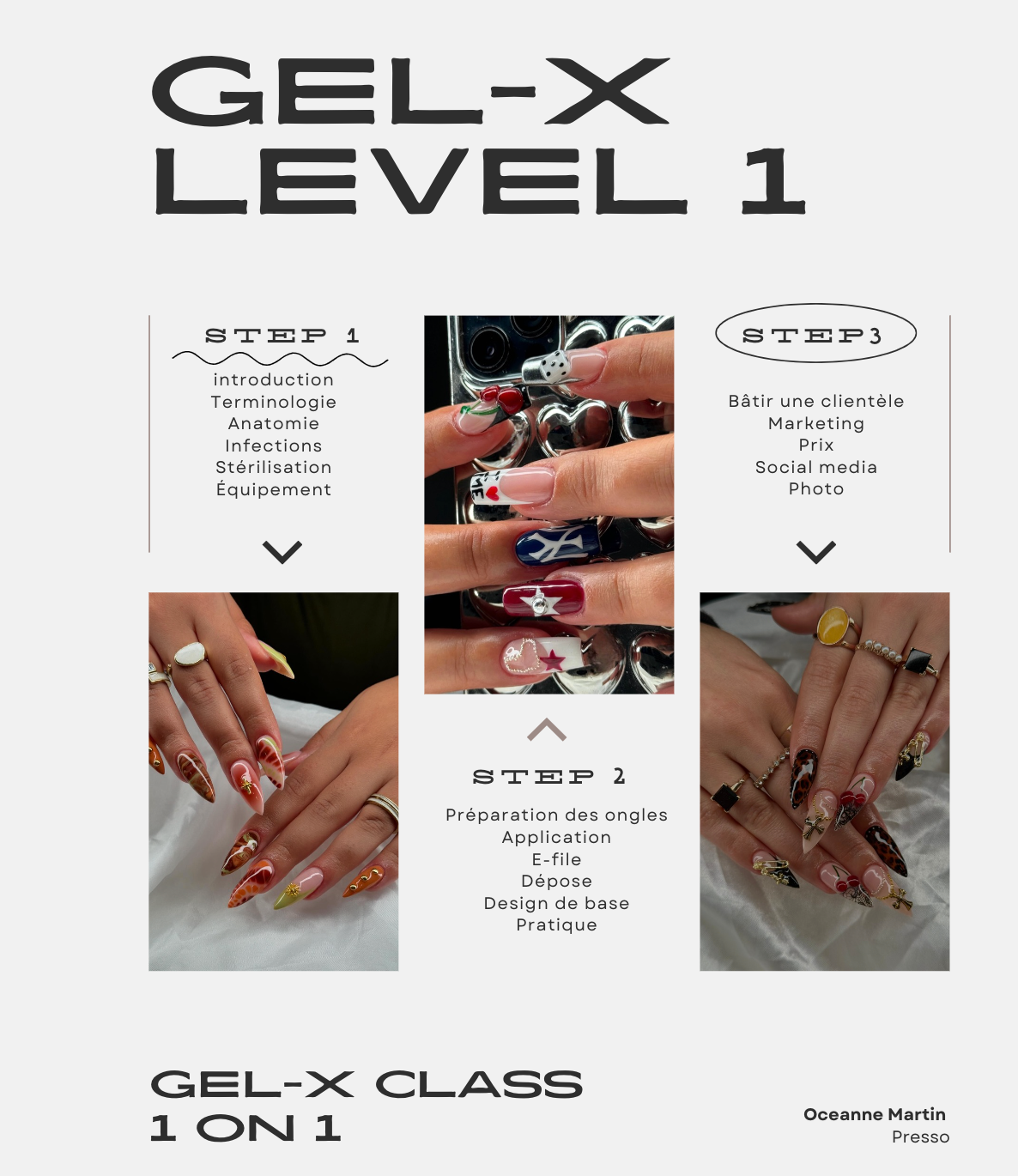 Forte de 10 ans d'expérience et d'une clientèle nombreuse, je suis parfaitement équipée pour vous enseigner tout ce qu'il faut savoir sur le métier de prothésiste ongulaire. De la technique au marketing, ma formation en présentiel de 2 jours vous permettra d'obtenir un certificat vous permettant de commencer à prendre en charge vos clients.